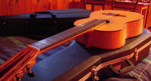 Guitare no. 30 Touche surélevée (Raised fingerboard) Table d'harmonie: Cèdre AAA (Cedar) Fond et éclisses (Back and sides): Érable (curled maple) Touche (Fingerboard): Ébène (Ebony) Longueur des cordes (Scale lenght): 640 mm Clés Schertler (Swiss made) |